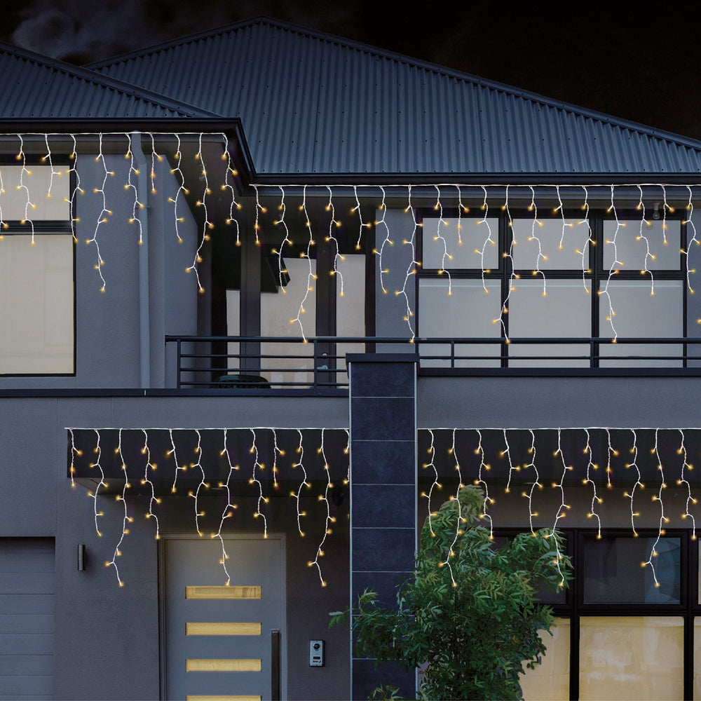Add a snowy glow to your holiday decor with the 480 Snowing Icicle Lights. Available in White & Blue, Cool White, Multicolor, and Warm White, these super bright LED icicle lights stretch 11.8m in lit length, featuring 7 flashing effects and a steady mode. Equipped with Memory Hold Technology and a built-in 8-hour on/16-hour off timer, these lights offer energy-efficient, hassle-free use. Cutter hooks are included for easy setup, making it perfect for indoor and outdoor displays.