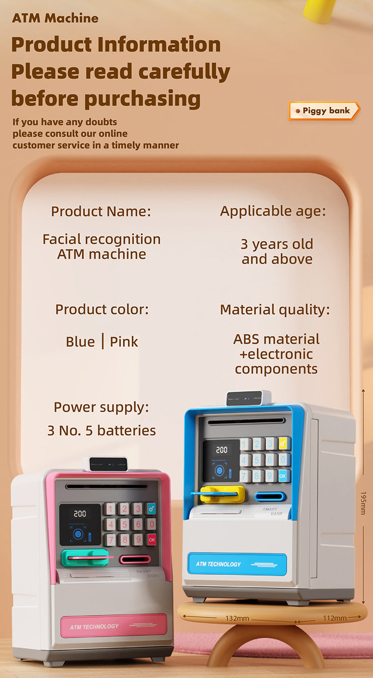 Introduce your children to the world of financial management with this cute and fun ATM Machine Piggy Bank. This thoughtful toy is designed as a "child financial manager" to help kids learn about saving money from an early age. It simulates real ATM operations, including card insertion, password entry, and even simulated facial recognition for a high-tech feel. With an automatic slot for paper money and a separate one for coins, saving becomes an exciting activity. The machine also features accompanying music and sound effects, making children fall in love with saving their money.