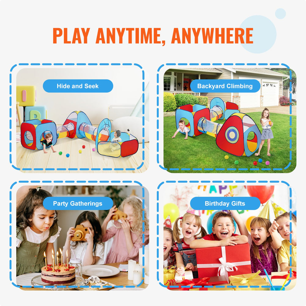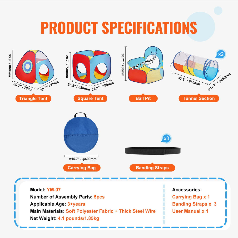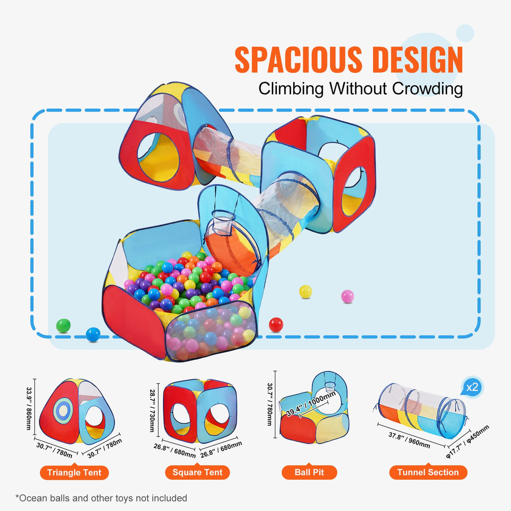 The vibrant and bright colors are designed to capture children's attention and ignite their imagination. With a 5-section design, kids can freely arrange and play, whether it's chasing, crawling, or playing hide-and-seek inside the tent tunnel. This stimulates children's brain development and provides endless joy!